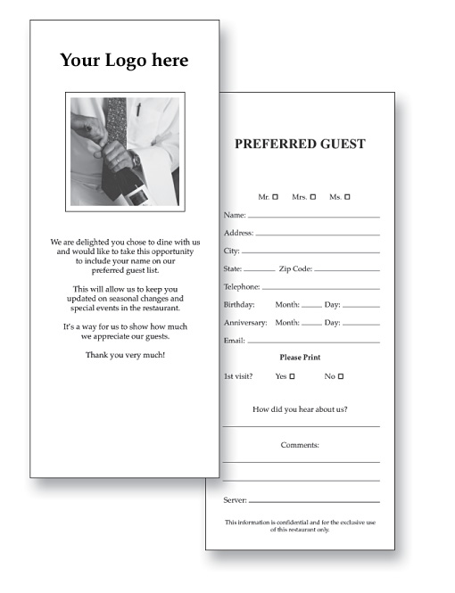 The creation of a database is at the center of any direct marketing strategy. RMS provides all the necessary tools to implement a customized program. This includes: design, printing, collection, and data input of your personalized customer cards. RMS will also train your general manager and staff on how to approach customers effectively and will also institute an incentive program to ensure maximum overall participation.
